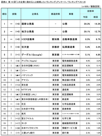 業種別では、第9回「この企業に勤める人と結婚したいランキング」(以下、前回)に引き続き公務員がトップとなったほか、製造業8社(トヨタ自動車、任天堂、アップル、ソニー、パナソニック、資生堂、花王、富士フイルム)が上位20社にランクインしています。