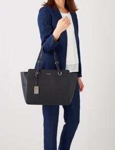 A4サイズの資料がすっぽりと入る大容量、底鋲付きの自立式、持ち手の長さが調節可能、汚れが目立ちにくい点もポイント。