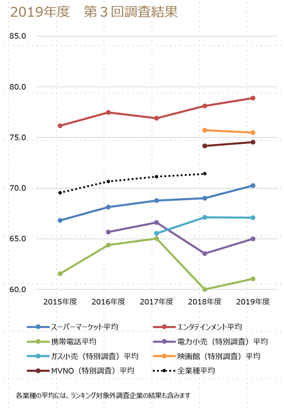 公益財団法人日本生産性本部 サービス産業生産性協議会は17日、2019年度JCSI(Japanese Customer Satisfaction Index:日本版顧客満足度指数)第3回調査として、7業種(スーパーマーケット、エンタテインメント、携帯電話、電力小売、ガス小売、映画館、MVNO(仮想移動体通信事業者))の顧客満足度を発表しました。主な調査結果は以下の通りです。本調査は、サービス産業の生産性を測るうえで重要な「顧客満足」を数値化・可視化して、企業や業種の成長に資する情報として用いることを目的とした日本最大級の顧客満足度調査です。