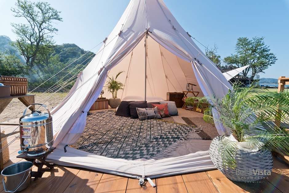 山や高原シーンが馴染み深いこのグランピングを、瀬戸内海に囲まれたベラビスタのアイランドビーチで、日帰りでお愉しみいただける(ご宿泊者のみ)アウトドア・ランチプランが誕生しました。