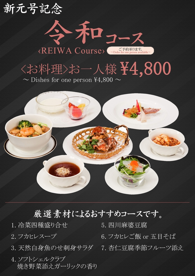 提供を開始した令和コースはフカヒレスープ、天然白身魚のせ刺身サラダ、ソフトシェルシュリンプ焼き野菜添えガーリック風味など7品から成る本格的な中華コースです。新元号令和の由来でもある梅の意匠をあしらって、お客様にご提供します。お値段はお一人4,800円(税込)です。