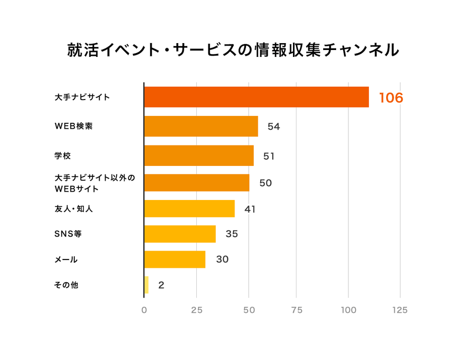 情報収集の方法としては大手ナビサイトを利用する学生が最も多いという結果になりました。ただしweb検索や、大手ナビサイト以外の就活サイト、学校からのお知らせで情報収集するという学生も一定数おり、複数のチャネルを併用して情報収集をしているようです。