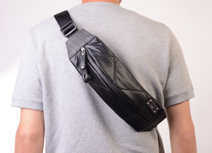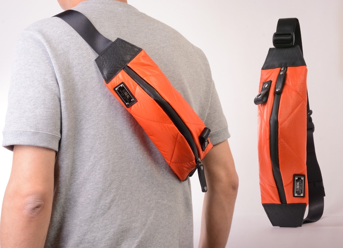 『藤倉航装コラボ/ボディバッグ AIR MODEL』は実際に航空自衛隊で使われているパラシュートと同等の素材を全面に使用し、各パーツには廃棄されたタイヤチューブをそのままの状態にてリサイクルしたスタイリッシュな形状のボディバッグです。パラシュート素材は耐久性・撥水性に優れており、どんな環境でもしっかりと内部を守ってくれます。またパラシュート素材の特性により、わずか140gの軽さを実現。肩への負担も少なく、素材の柔軟性により身体にぴったりとフィットします。