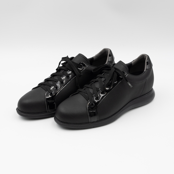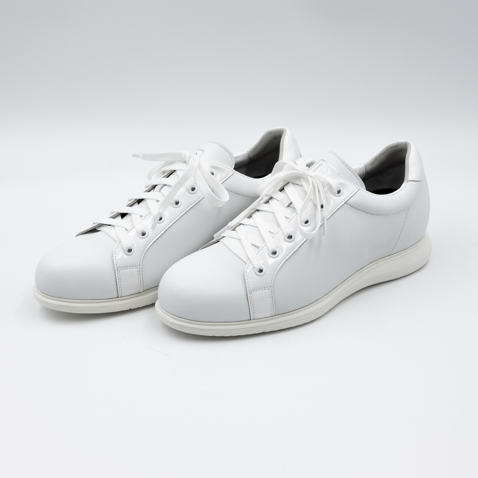さらに、アッパーには雨や汚れに強く、ストレッチ機能のついた高級人工皮革を使用。インソールは抗菌・防臭機能付きで靴の中は常に清潔を保ちます。また、弾力性の高い衝撃吸収に優れたヨーロピアンデザインのアウトソールを採用しと、跳ねるような履き心地を実現。でさらには4.5cmのヒールで長身・脚長効果を盛り込みました。デザインはマットな風合いの中にワンポイントでエナメルを使用、シンプルながらも洗練された印象に。ボディバランスCOOLスニーカーは、これまでのスニーカーにない履き心地とデザインが融合した1足に仕上がりました。