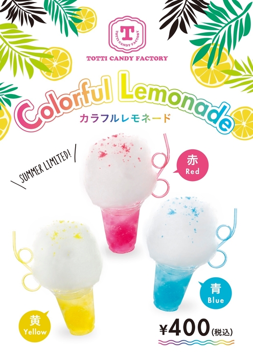 夏らしいドリンクのレモネード。定番の黄色からレモネードとしては珍しい赤、青色のカラフル展開をしました。わたあめをのせた当店ならではのカラフルレモネードをお楽しみください。