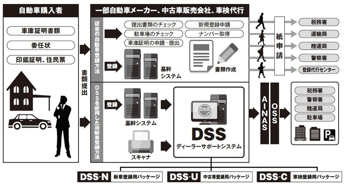 ディーラーサポートシステム「DSS」は、自動車業界各社の基幹システム等から申請に必要な車両データ等をまとめてAINAS/OSSへ送信することで申請がワンストップで完了します。また、システム画面への入力を最小限に止め、短時間で自動車の登録データを作成する事が可能です(保管場所証明等の画像ついてはスキャナでデータの取り込みを実施)。