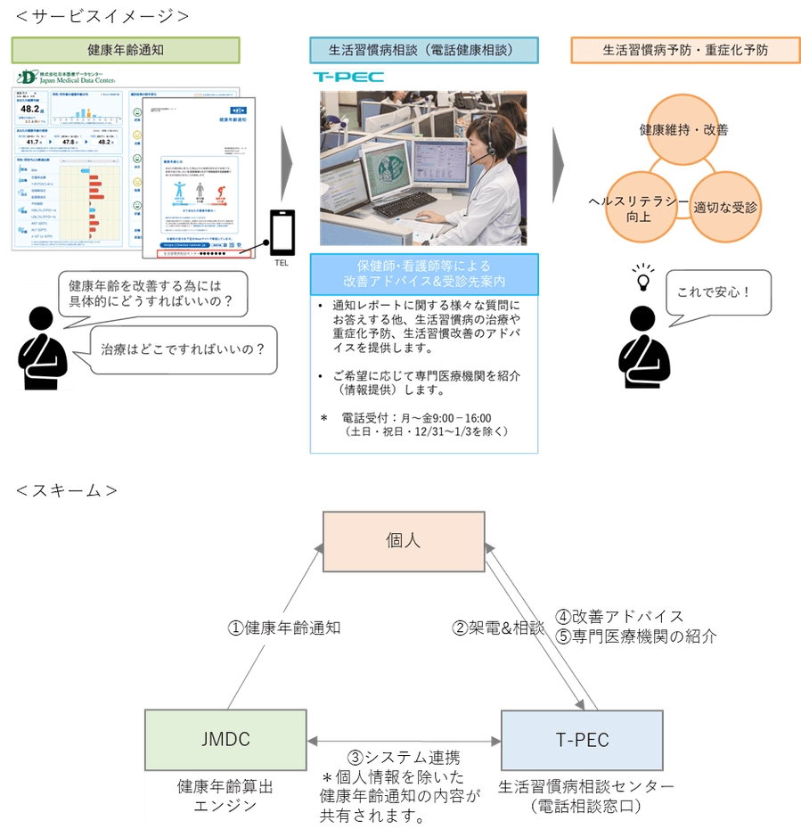 ノーリツ鋼機株式会社(本社:東京都港区、代表取締役社長CEO:西本 博嗣)のグループ子会社である株式会社日本医療データセンター(本社:東京都港区、代表取締役社長:上沢 仁、以下 JMDC)と電話健康相談事業を提供するティーペック株式会社(本社:東京都台東区、代表取締役社長:砂原 健市、以下 T-PEC)は業務提携し、「健康年齢(R)」通知レポートと生活習慣病相談を組み合わせたサービスパッケージを保険者(健保組合、市町村国保、共済組合等)、企業、医療機関等に向け、販売開始します。