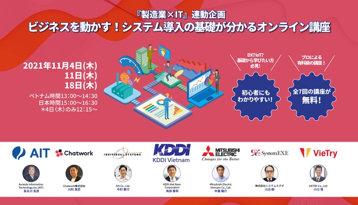 講師としてKDDI、三菱電機、IVS、システムエグゼ、Chatwork、AIT(三谷産業グループ)、VIETRY(ブランディングテクノロジーグループ)と、日本及びベトナムでのシステム・サービスの豊富な導入実績を持つ7社が登壇します。