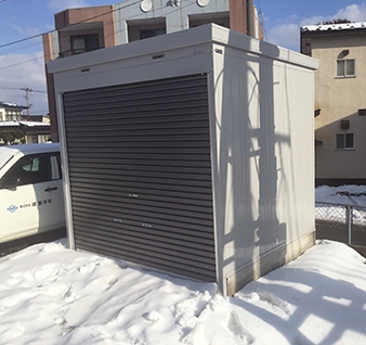 秋田県秋田市の製作所敷地内にシャッター付き物置を納入。