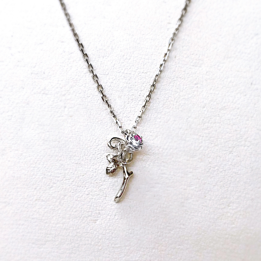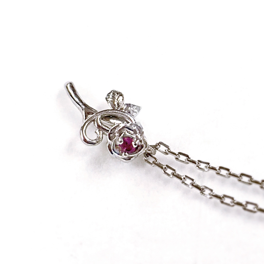 デザインは、バラと名前のイニシャル「D」のモチーフを組み合わせ、天然のルビーを留めています。