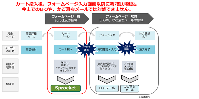その解決策として、多くのお客様にご活用いただいているのがSprocketです。ユーザーがカートページに投入後、実際にフォーム入力するまでの平均時間58秒間※1に、様々な不安や迷いを払しょくするためのポップアップによるWeb接客をすることで、離脱の改善を実現します。