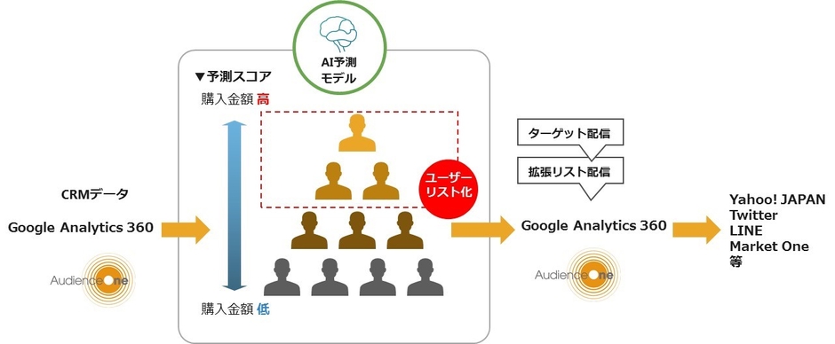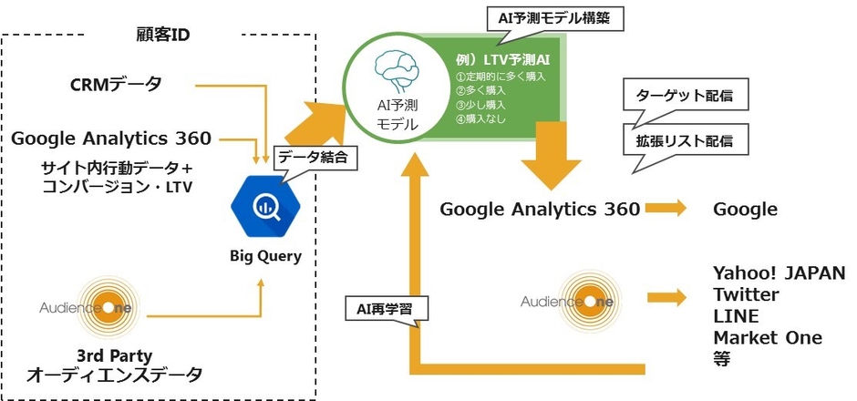今回、アイレップとイー・エージェンシーは、顧客IDとGoogle アナリティクス 360 、AudienceOneが持つ独自のオーディエンスデータを掛け合わせることで、外部サイトでの行動情報を豊富にし、AI予測モデルの学習データを高精度化しました。これにより集客しやすい高LTVユーザーをリスト化(注2)し、ターゲティング配信もしくは類似ユーザーへの拡張配信を行います。
