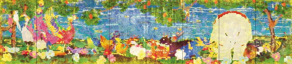 伊藤若冲(1716 – 1800)は、近世日本の絵師の一人。江戸時代中期の京都にて活躍した。若冲は、画面全体を数万もの升の形に区切って升目ごとに彩色する、『升目画』という特異な表現方法を残している。本作品は『鳥獣花木図屏風』や『樹花鳥獣図屏風』をモチーフにしている。