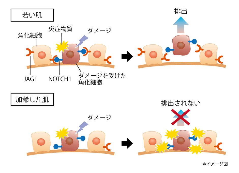 今回、肌の表皮を構成する角化細胞に紫外線を照射した結果、紫外線でダメージを受けた細胞(ダメージ細胞)では「NOTCH1」と呼ばれるタンパク質の発現が特異的に高まることを突き止めました。また、NOTCH1が周囲の角化細胞の「JAG1」と呼ばれるタンパク質に結合すると、NOTCH1を発現する細胞が優先的に排出されることが分かりました。つまり、肌のターンオーバーにおいて、ダメージ細胞が優先的に排出されていることが分かりました。また、加齢によって角化細胞のJAG1の発現が減少することから、JAG1とNOTCH1が結合する機会が減少することでダメージ細胞が蓄積し、肌の老化が進行すると考えられました。