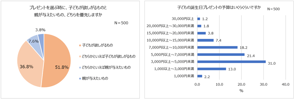 最初に、プレゼントの選び方として、子どもが欲しがるものと親が与えたいもの、どちらを優先するかを尋ねました。すると、「子どもが欲しがるもの(51.8%)」、「どちらかといえば子どもが欲しがるもの(36.8%)」と約9割が欲しがるものをプレゼントしたいと考えていることが判明。子どもの喜ぶ姿が見たい親心がうかがえます。