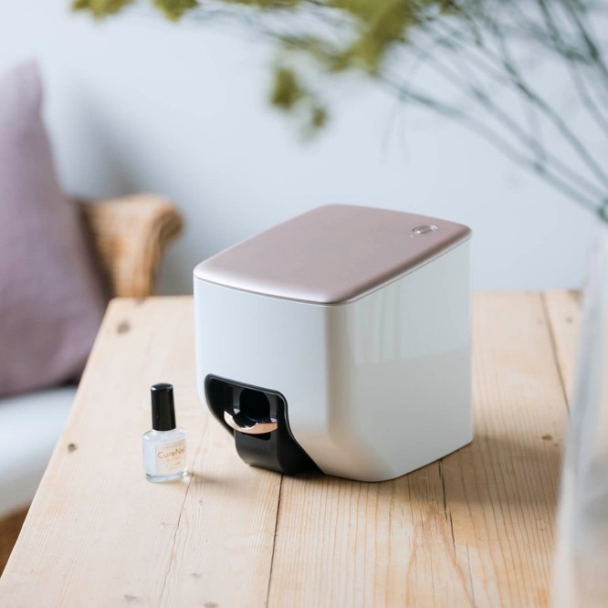 CureNelは、好みのデザインを爪にプリントできるネイルアートプリンター。お好みの画像ファイルをスマートフォンに保存しておけば、写真を含め人の手ではなかなか描ききれない複雑な絵柄をネイルアートとして施すことができます。プリント時間は約10秒と、手軽にオシャレを楽しめるのが特徴です。