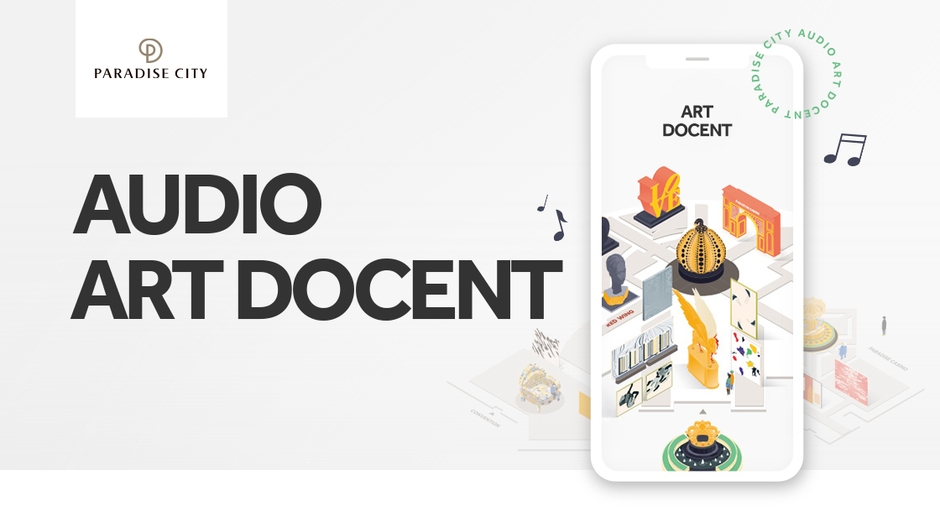 パラダイスシティでは「多くのお客様に本物のアートを楽しんでいただく」という想いのもと、所有する3000点余りのアート作品を敷地内の至るところに展示しています。また韓国の有名俳優「イ・ビョンホン」、「ファン・ジョンミン」、「ハ・ジウォン」が館内のアート作品を音声で紹介するオーディオアートドーセントをホームページ上「ART MAP」で公開。俳優の写真をクリックすると、俳優の声で録音された作品解説を聞きながら、パラダイスシティの作品を鑑賞することが出来ます。オーディオアートドーセントでは、日本でも絶大な人気を誇る草間弥生の『Great Gigantic Pumpkin』や、新宿のシンボルとして知られている『LOVE』のモニュメントで有名なロバート・インディアナの作品『LOVE,NINE』、アレッサンドロ・メンディーニの『パラダイス・プルースト』、デミアン・ハーストの『Golden Legend』など世界に誇る有名アーティストの15の代表作品を紹介しています。