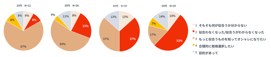 同回答者を年代別に切り分けて、動機の分類を比較してみると、40代の「似合わなくなった/似合うがわからなくなった」は37%で、30代よりも10ポイント以上増加。50代では52%と半数以上に達しました。