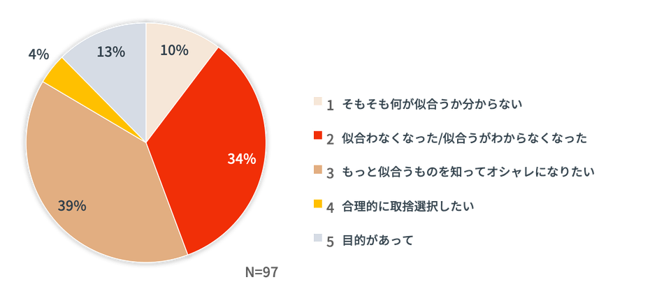 COLOR&STYLE1116の診断を予約をいただいたお客様に対する事前アンケートで、診断の動機を伺うと、「もっと似合うものを知ってオシャレになりたい」(39%)が最も多く、「似合わなくなった/似合うがわからなくなった」(34%)が続きます。