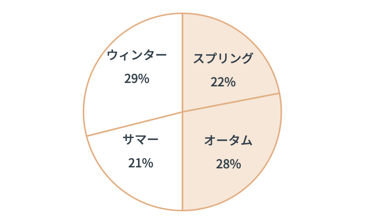 COLOR&STYLE1116サロンで「パーソナルカラー診断PLUS」を受けられた方の、パーソナルカラー4シーズンの割合を見ると、「スプリング」(22%)、「サマー」(21%)、「オータム」(28%)、ウィンター(29%)となり、ほぼ偏りはありませんでした。イエローベース(スプリングとオータム)と、ブルーベース(サマーとウィンター)で見ると、ちょうど5割ずつという結果に。