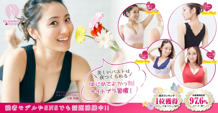 紗綾さんには初めのイメージキャラクター活動として「グラマラスエンジェル」ブランド第1弾の商品、睡眠中に美しくグラマラスなバストに導く「リフティングナイトブラ」のPRや販売促進をしていただきます。