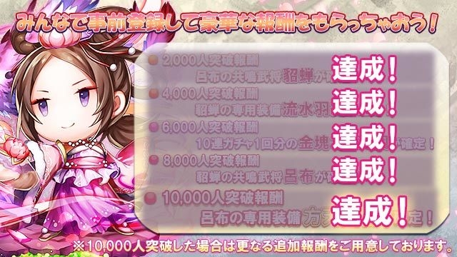 事前登録キャンペーンはわずか2週間で1万人を即突破。呂布と貂蝉に加えて呂布と貂蝉がパワーアップする専用装備の超豪華特典に付け加え、10連ガチャ1回相当の金塊3,000個を全てのプレイヤーにご用意しております。