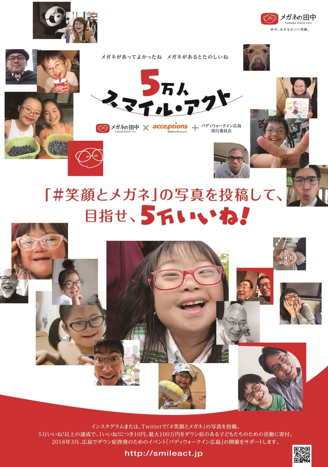 ■内容:期間中に「#笑顔とメガネ」「#smileact」「#メガネの田中」のハッシュタグとともにインスタグラム、ツイッターに投稿された写真の“1いいね”に応じて10円(最大100万円)を、ダウン症のある子供たちのための様々な活動のために寄付するプロジェクト。
