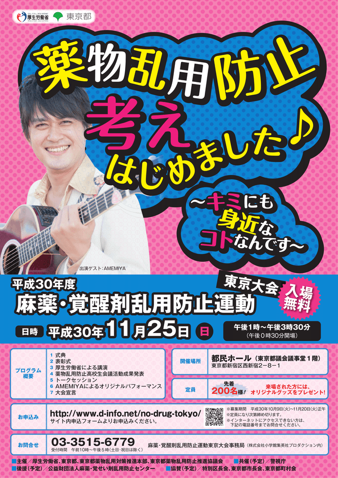 本年は、東京都内の高校生による「薬物乱用防止高校生会議」の成果発表や、「冷やし中華はじめました」でおなじみのシンガーソングライター芸人・AMEMIYAさんによる本大会オリジナルのライブパフォーマンスのほか、薬物乱用に関する専門家とのトークセッションなど、様々なプログラムを通して、身近なところから薬物乱用問題について考えていきます。