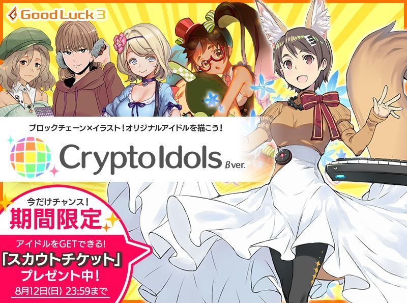 2018年7月27日(金)に株式会社グッドラックスリー(本社:福岡県福岡市、代表取締役社長:井上 和久、以下「グッドラックスリー」)は、ブロックチェーン技術を活用した新サービスとして、『オリジナルアイドル』(以下、アイドル)のイラストを投稿できる『CryptoIdols(クリプトアイドル)』(以下、本作)のβ版サービスを開始いたしました。