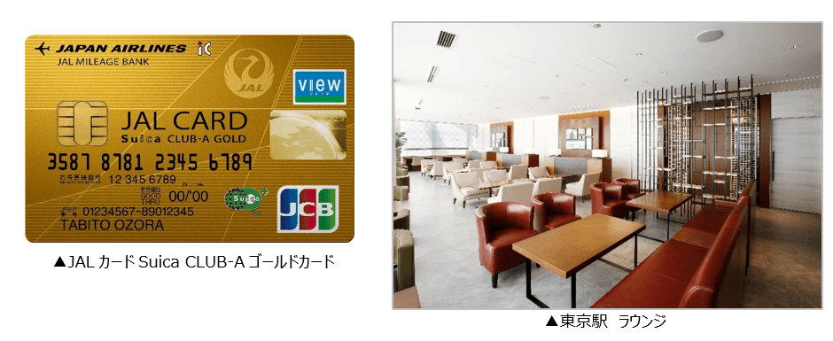 JALカードSuica ゴールドカードは、現行の「JALカードSuica」の機能に加え、空港のゴールドカード会員専用ラウンジや東京駅のビューゴールドラウンジをご利用いただくことができます*。また、ビューカードとの提携により、JALカードとしては初のサービスである、旅行中だけでなく日々の鉄道利用時でも改札口内の傷害事故が補償の対象となる国内旅行傷害保険や、ご利用金額に応じた豪華ご利用特典等が提供されます。