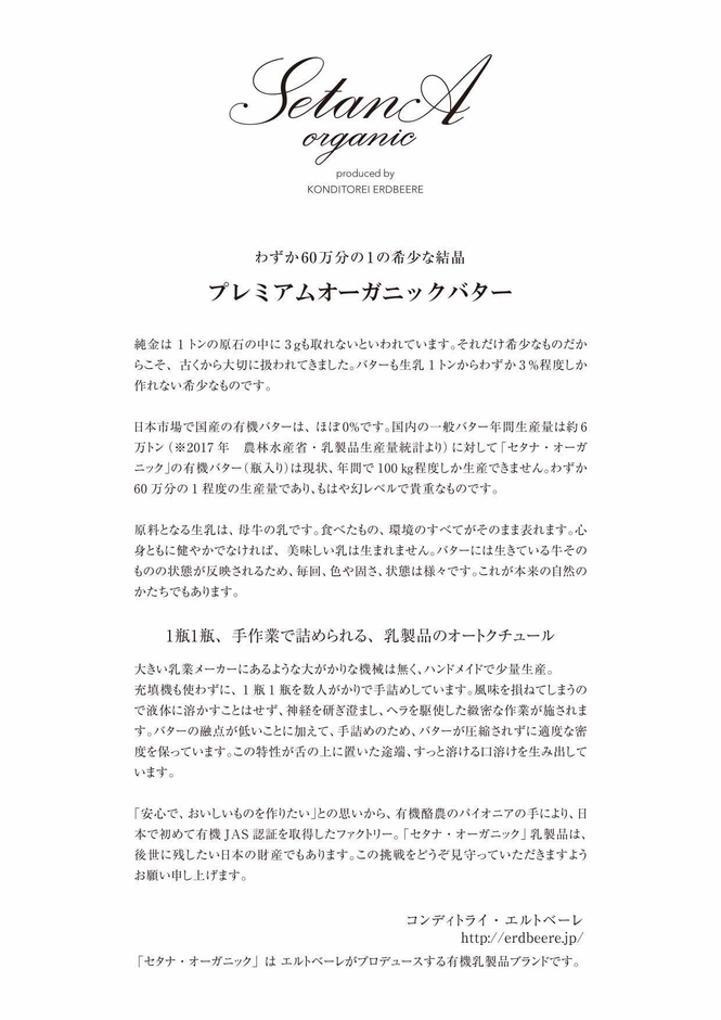 「セタナ・オーガニック 有機バター」は、日本で初めて、乳製品でオーガニック認証を取得した有機酪農のパイオニアから生まれた逸品です。25年以上前から有機に取り組み、日本で初めて、乳製品の「有機JAS」を取得し、以後、その高い水準を守り続けている、北海道の瀬棚(せたな)にある牧場と小さな乳製品ファクトリーと有機酪農界のパイオニアと佐藤さん(エルトベーレ)が出会い、有機乳製品ブランド「SetanA organic(セタナ・オーガニック)」が生まれました。純金は1tの原石から3gしか取れないと言われます。バターも生乳1tからわずか3%しか取れない大変貴重なもので、国内の一般バター総生産量に対し、セタナ・オーガニックの有機バターはわずか60万分の1という幻のレベルです。(※2017年農水省統計)大手の乳業メーカーにあるような大きい機械は無く、ハンドメイドで少量生産。正に乳製品のオートクチュールなのです。