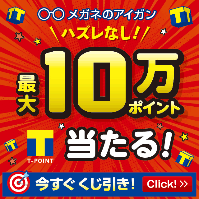 Yahoo!ズバトク内の「メガネの愛眼 必ず当たるTポイントくじ」にて、くじを引いていただいた方に最大10万ポイントのTポイントが当たるくじです。「ハズレなし」ですので、皆様にお喜びいただける内容となっております。