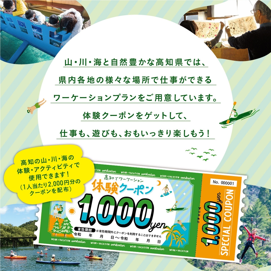 現在、高知県では、本県の魅力である「自然」・「体験」のコンテンツを楽しんでいただくワーケーションを推進するため、県内でワーケーションを実施する方に対して、県内の体験・アクティビティに利用できるクーポンを配布するキャンペーンを開催しています。