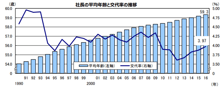 企業における経営者の平均年齢は高齢化の一途を辿り、後継者不在などで休廃業・解散を余儀なくされる場面に直面しています。『平成28年版高齢社会白書』(内閣府発表)によると、65歳以上の高齢者人口は3,392万人に達し、総人口の26.7%を占めます。社長の平均年齢は59.3歳となり過去最高を更新しています。今後一層の高齢者増加・人口減少が見込まれるなか、企業の繁栄と存続に向け、事業承継・M&Aを視野に、早い段階で準備に着手していく必要があります。(2017年帝国データバンク「2017年全国社長分析」より一部抜粋)