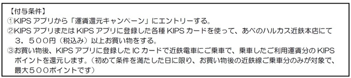 KIPS アプリから「運賃還元キャンペーン」にエントリーし、KIPS アプリまたはKIPS アプリに登録した各種KIPS カード※1を使って、あべのハルカス近鉄本店で3,500円(税込み、KIPS ポイント利用分を除く)以上お買い物いただき、KIPS アプリに登録したIC カード※2で近鉄電車にご乗車で、乗車したご利用運賃から最大500 円分をKIPS ポイントで還元いたします。