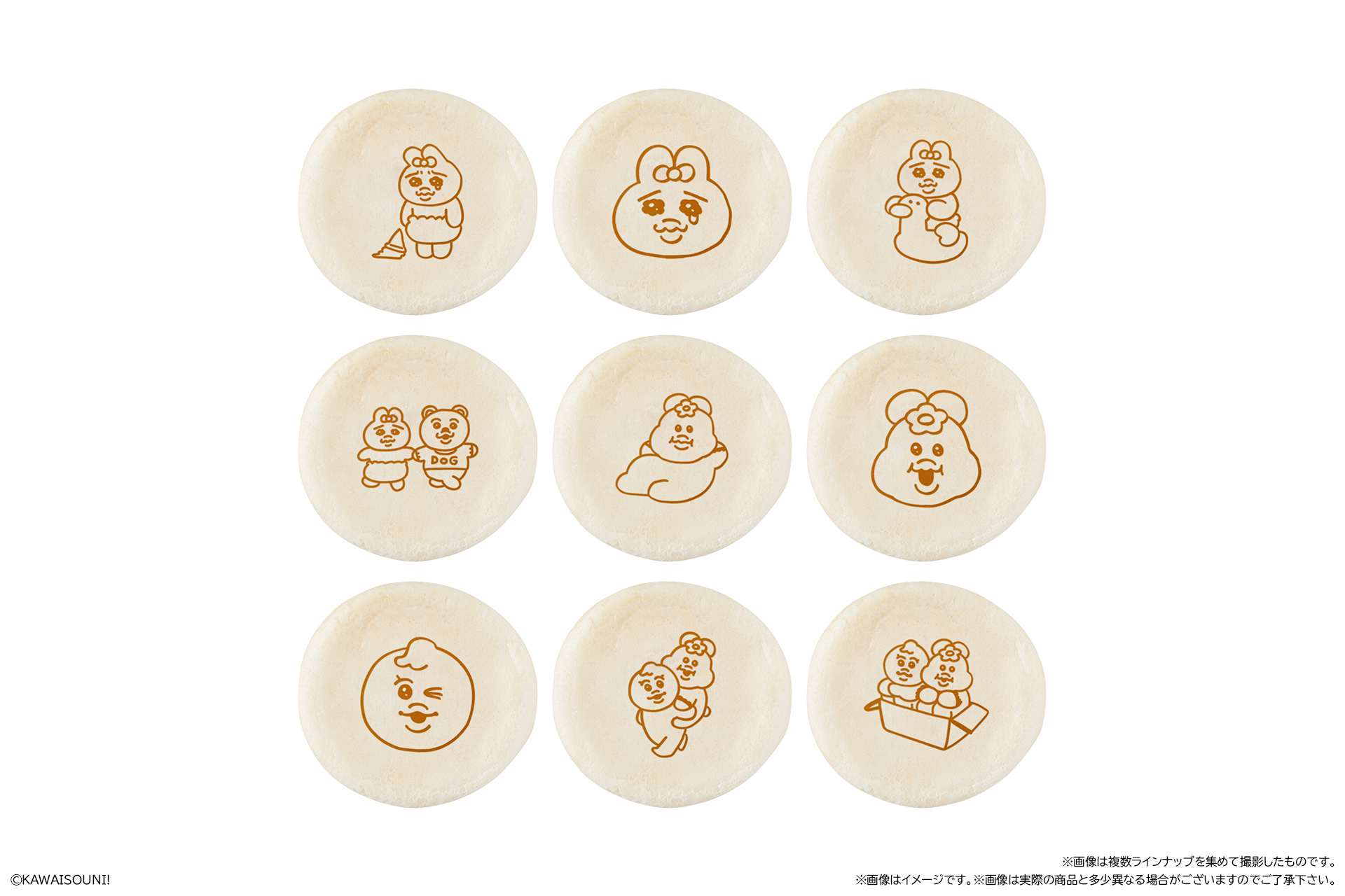 もちもちの今川焼きに、ミルク味のクリームが入ったスイーツです!今川焼きの表面には、おぱんちゅうさぎやんぽちゃむたちのかわいい表情やポーズの焼き印が押されています。笑顔や今にも泣きそうな顔など、それぞれ異なるデザインを楽しめます。(全9種)