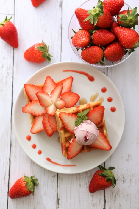 中でもオススメは「生いちごワッフル」。ワッフルが見えなくなるほどトッピングされたいちごはまるでお花畑のよう。味はもちろん見た目の豪華さにもこだわった一品で、食べるのがもったいないほどです。サクサクの自家製ワッフルと甘さ控えめの生クリームにいちごの濃厚な甘味と程良い酸味が効いたプレミアムなスイーツです。