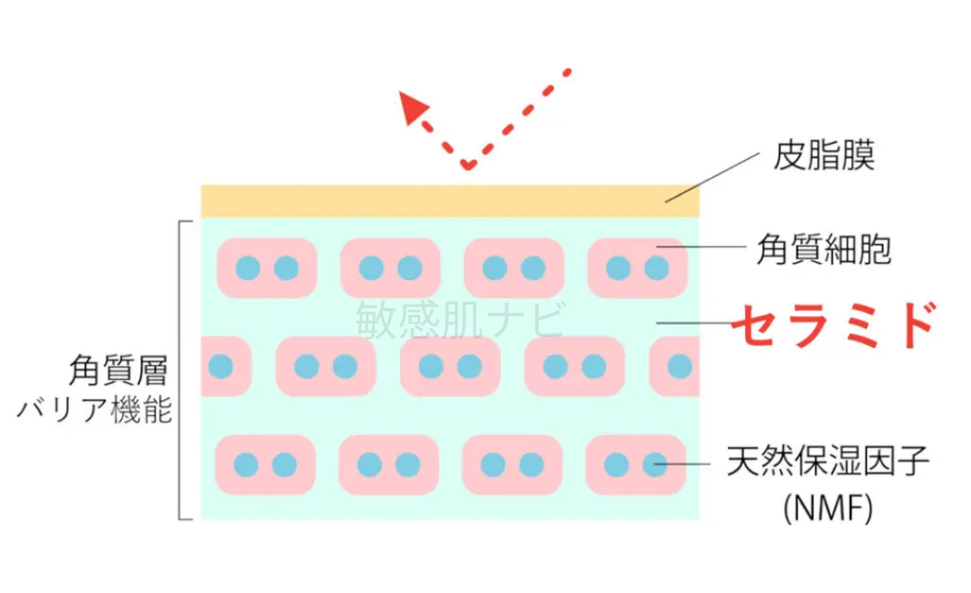 敏感肌などでこの部分が弱いと水分喪失が増え、外部刺激に弱くなるため、セラミドを補う重要性が示されています。