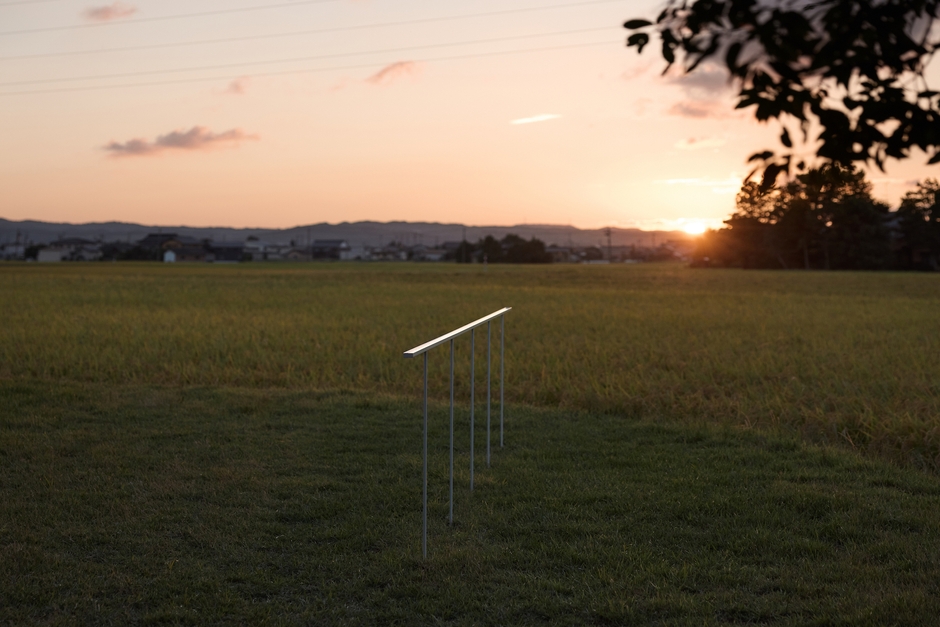 「返礼」は「タマ/アニマ(わたしに息を吹きかけてください)」と、散居村の水田に臨む庭が一体となった作品です。「タマ/アニマ(わたしに息を吹きかけてください)」は、幅3.65cm、長さ460cmの繊細な水路に水が張られた立体作品で、息を吹きかけることで生まれる波紋が水面を伝わり、その先に広がる散居村へと意識を誘います。