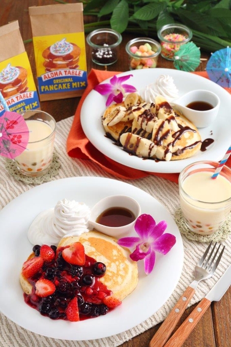 さらに、軽い食べ心地の豆乳ホイップクリーム、甜菜糖から作ったコクのあるシロップなど、「アロハテーブル」こだわりのレシピを、お子さまと一緒に楽しみながら作ります。いろいろなアレンジができるよう、トッピングもご用意!それぞれお好みで盛り付けたパンケーキは、タピオカ入りのトロピカルジュースと一緒に召し上がっていただきます。