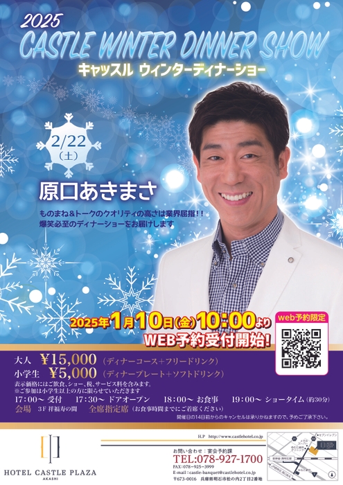 株式会社キャッスルホテル(社長:成田良伸)は、JR西明石駅近くのホテルキャッスルプラザ(兵庫県明石市松の内2-2)にて、2025年2月22日(土)の夜、モノマネ芸人・原口あきまささんを迎えた新春ディナーショーを開催します。