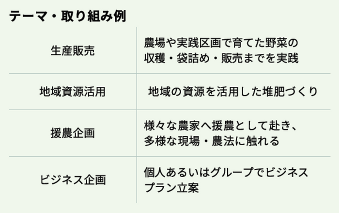 テーマを受講生自身が設定し、学びと実践を行き来することで理解が定着し、自分自身の農的チャレンジを形にしていくことができます。