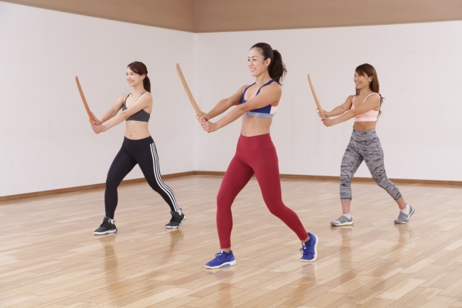 剣道の動きをベースに、長さ約55㎝の軽量の木刀を持ちながら、和テイストな音楽に合わせ、緩急のあるリズミカルな動作を繰り返し行います。