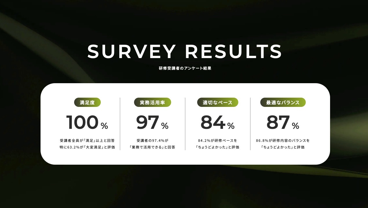 短時間でも「実務に活かせる」「わかりやすい」といった評価を得ており、安心して受講いただける研修内容となっています。