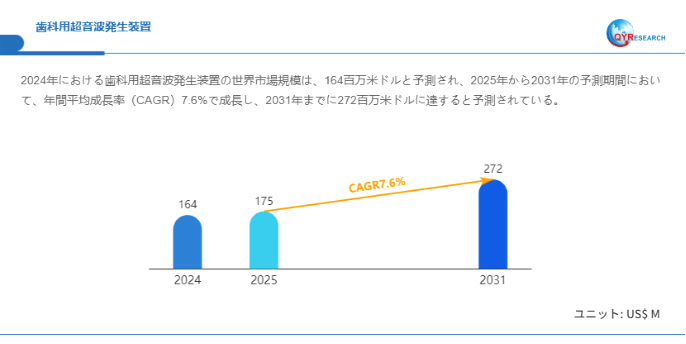 QYResearchが発表した新たな市場調査レポート「歯科用超音波発生装置―グローバル市場シェアとランキング、全体の売上と需要予測、2025~2031」によると、世界の歯科用超音波発生装置市場規模は2024年の約164百万米ドルから2025年の175百万米ドルへと順調に拡大すると見込まれ、予測期間中は年平均成長率(CAGR)4.7%で成長し、2031年には272百万米ドルに達すると予測されている。