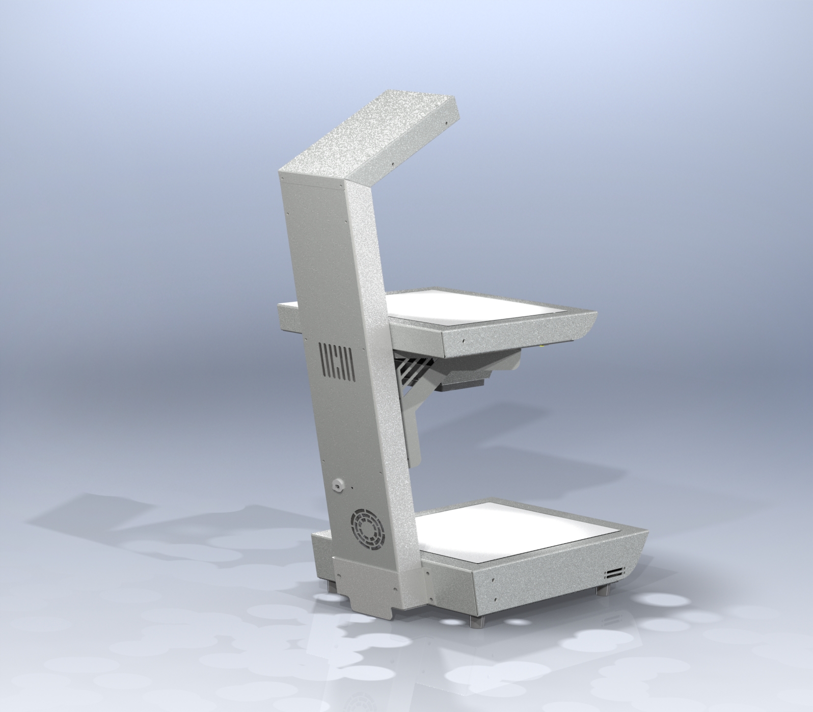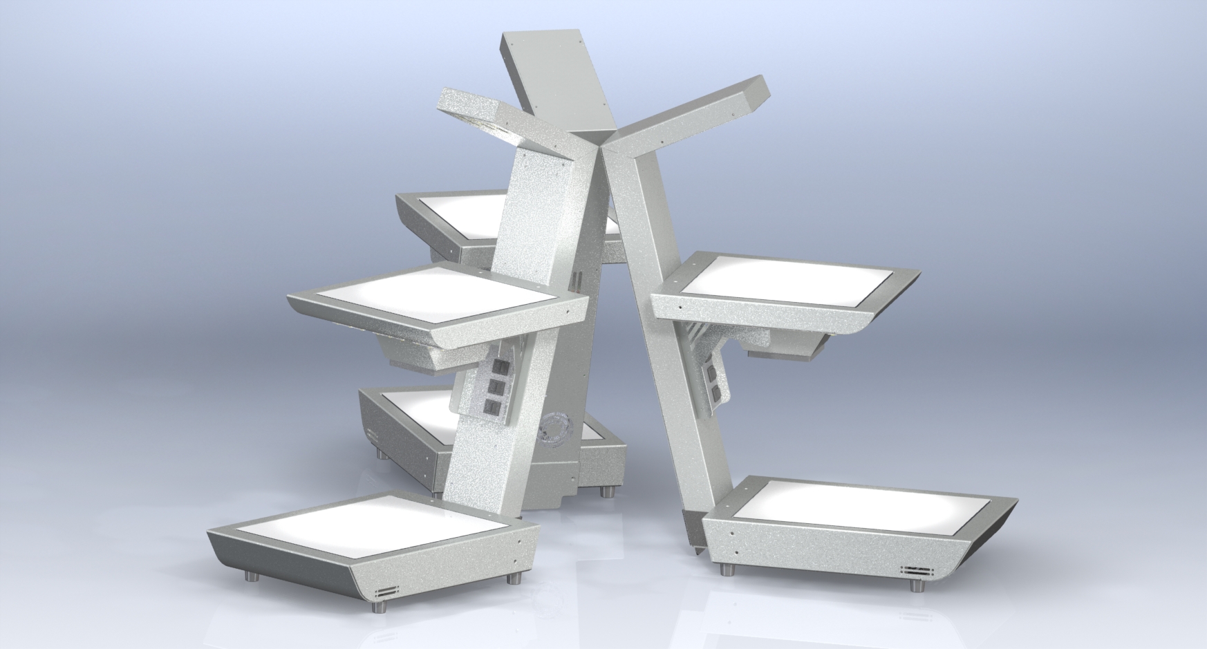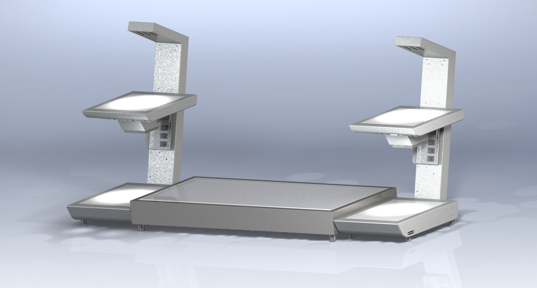 低ランニングコストや静かなビュッフェ機器としてペルチェ冷却方式を採用していますが、プレートの厚み寸法が大きくなる構造をR曲面の取り入れによりシンプルにしています。また、2段式にすることで倍増するコストは最善の設計手法により極力低コストに抑え、タイジの設計力を注ぎ込んで自信を持ってお勧めする製品に仕上がりました。2段式ホットプレートの長所であるLED照明、使い勝手を優先した背面柱の構造をそのまま採用し、他社には無い製品としてご使用いただくユーザー様には様々なイメージを膨らませていただき、立体的な料理の陳列やLED照明による料理のアピールに大変満足していただき、皆様の期待を超える製品であると確信しております。(開発部:S氏)