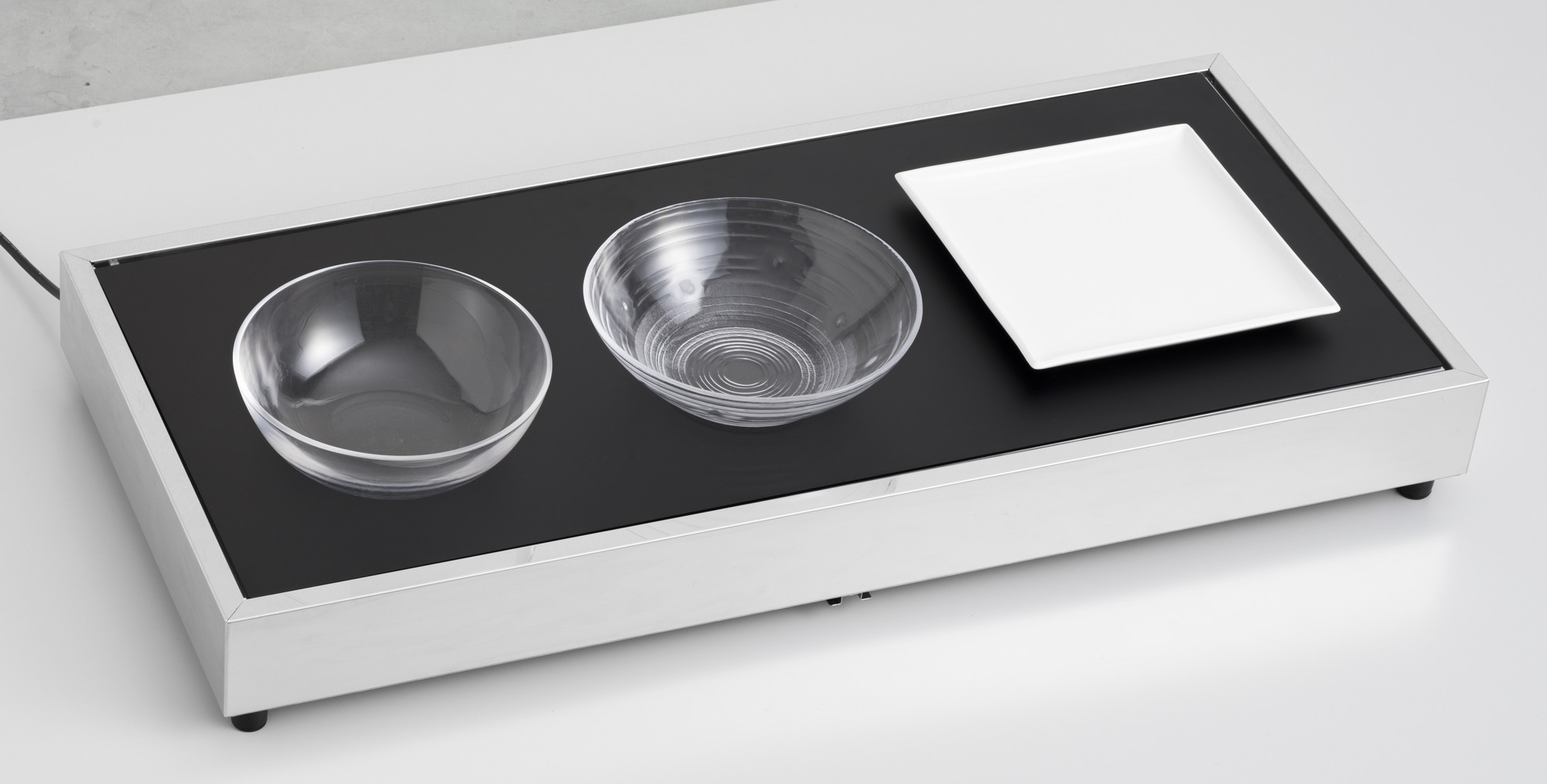 ビュッフェスタイルの食事では、豊富なメニューが並ぶ一方で、限られたスペースでの配置が大きな課題となります。そこで、私たちは限られた空間を最大限に活用し、昨年発売の2段式プレートヒーターに続き立体的な演出が可能な保冷できる製品が欲しいユーザー様の声もあり、きっとお客様に喜ばれるのではないかと考えました。今まで立体感を出す為には、ビュッフェ台をひな壇に造作するかスタンド等を使い常温で陳列する方法が一般的でした。この度、当社では昨年の2段式プレートヒーターからスピーディーに開発準備を進め、2段式クールプレートCPW-300(GW)を新たなビュッフェラインの演出に更なる革命をもたらす製品として提案させていただきます。また、皆様から好評頂いておりますデュアルプレートDP-555では、サイズの大きい製品のご要望が多く製品化の実現に至りました。ワンタッチでプレート面を冷温に切替できる機能なので、サイズを大きくした事により社員食堂等で有効な大皿等の季節に合わせた盛り付けが冷も温も美味しさそのままにご提供できます。更に造作された雛壇で複数台ご利用いただければ効率の良いダイナミックなビュッフェ台が完成いたします。