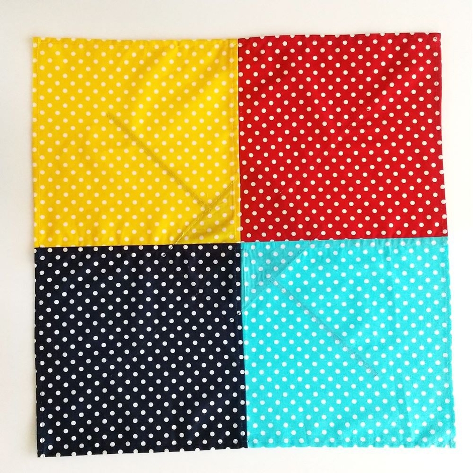 - 同色の直線で示された1対の対角線の布の両端を合わせる