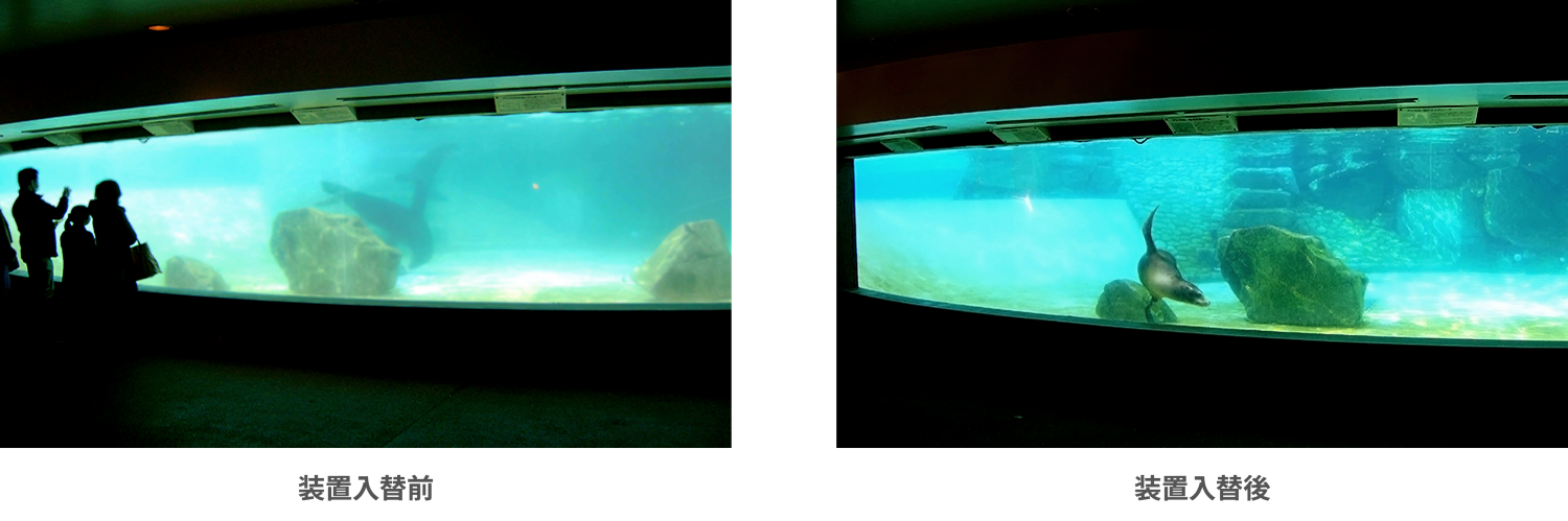 課題 → アシカ池の水に濁りが発生し、水面下に設けた窓からアシカの泳ぐ姿がきれいに見えない。