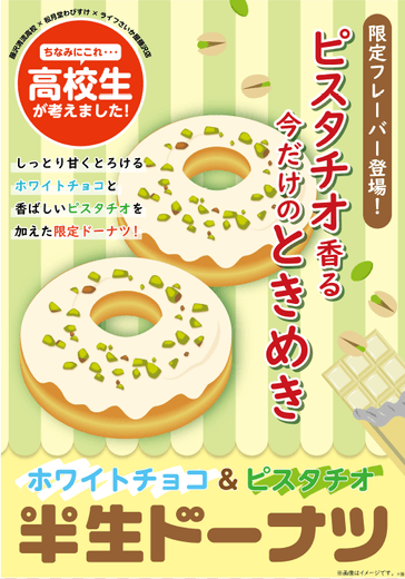 特 徴:しっとり甘くとろけるホワイトチョコと、香ばしいピスタチオを合わせた半生ドーナツ。